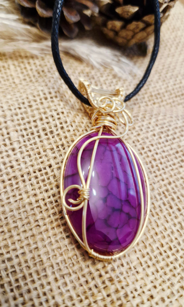Pink Dragon vein agate pendant wire wrapped in gold copper wire.